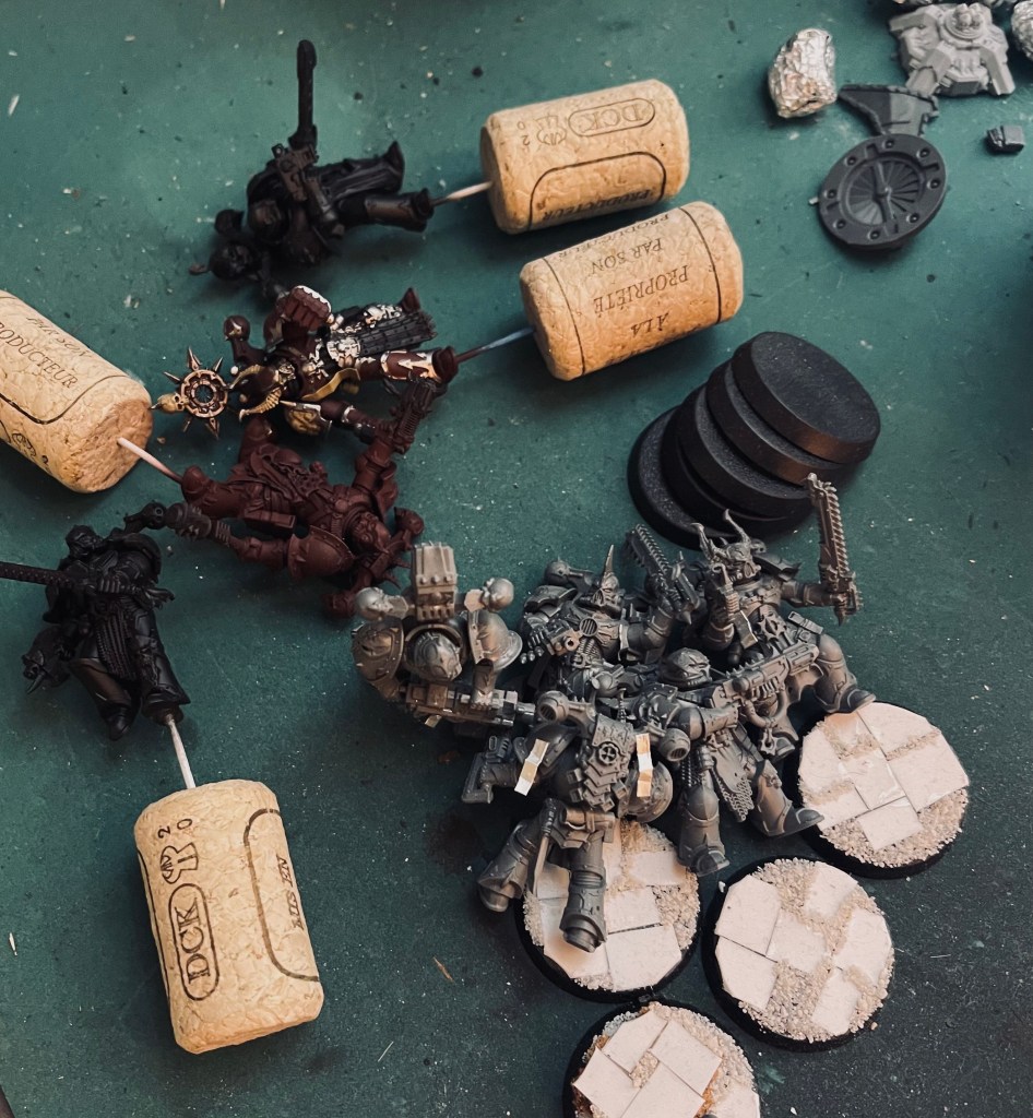 What didn’t change was my desire to start a new army in the 40K/rules system that is distinctly different enough to avoid lawsuits space. Specifically, one filled with adoration for the dark gods, full of mutations and evil guy vibes and all that fun stuff Chaos Space Marine’s represent. I started kit bashing stuff together with no particular lore-based motivation; just making what looked cool to me and felt good in the moment. That willingness to just go with the flow of my hands and the bits brought me right back into the groove, and I’m now looking forward to working on this project again.