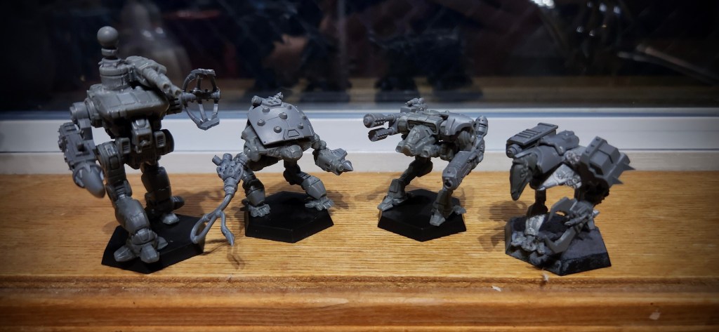 I brought up the free rules for Flame of Orion as well as a whole gang of mechs to serve as the base for our kit bashes. Since it was both our first time with the rule set, and rolling on tables is hype as hell, we rolled up 4 mechs each using the Quick Play rules then set out to build them out of the bits we brought with us. As you can see from the pictures below, I think we did a pretty good job. Note – when packing baking soda for weathering/dealing with my dry time impatience, definitely make it look like a tightly rolled up zip-lock bag of a certain illicit substance. Winning move of the weekend for sure.