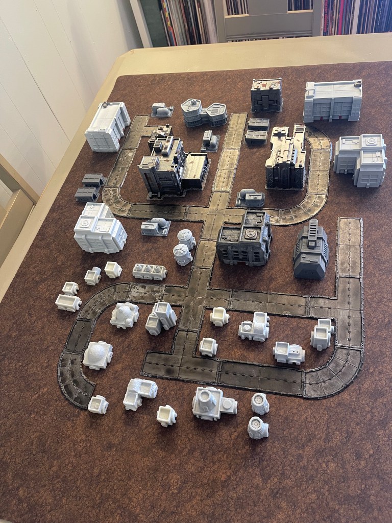 Yes I know it’s in a weird half painted/half not state, but such is life. If you look closely, there are even some of the dreaded enemy of all narrative gamers – L SHAPED BUILDINGS! As my Sun Rot terrain project earlier this year proved, I’m a sucker for terrain that provides a narrative before you even start rolling dice. This setup gave me big corporate research base with on site staff houses and after that rolled around in my brain for a good 12 hours, out popped a bit of lore for our corner of the Orion Sector, as well as a custom scenario that sees the players intercepting a distress call from this base and going to loot it for any shiny new tech they were researching. Real stand up folks, these mech pilots.