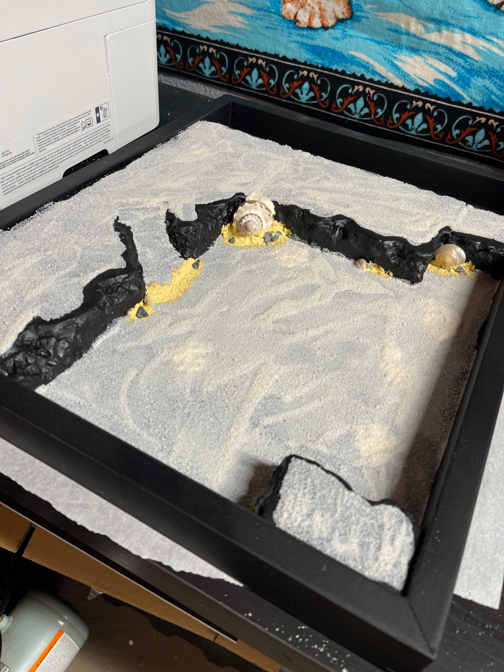 I did some gap filling where the big shell meets the cliffs to integrate it a bit better using ripped up toilet paper soaked in mix of mod podge, water and grout powder. I don’t actually know if the grout powder does anything, but it makes me feel like I’m really doing something when I add it to things. Also alchemist vibes and I’m all about that. I forgot to take pictures of this step so just imagine a gloopy paper mache mess and me poking it into little corners and gaps. As I made far too much (as usual) I used some in the beach area to add some ground variation so it wasn’t completely flat. After this dried I busted out the classic Black Magic Craft black mod podge technique (the man, the myth, the legend!) to seal the foam and give it a bit of a harder shell. Shell because, you know…Omen Tide. Anyways, moving on.